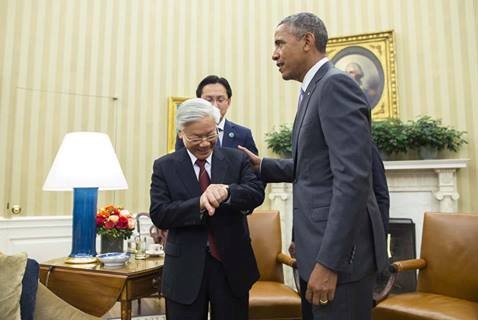 Tổng thống Obama và Tổng Bí thư Nguyễn Phú Trọng cùng nhìn đồng hồ sau cuộc hội đàm kéo dài hơn dự kiến hàng chục phút