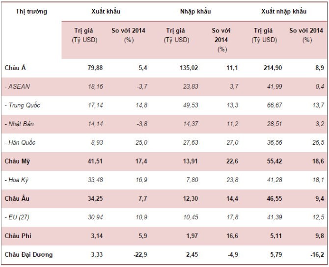 Xuất khẩu hàng hóa sang thị trường Trung Quốc và Hàn Quốc lần lượt là 16,6 tỷ, tăng 11,2% và 8,93 tỷ, tăng 25,03% so với năm 2014. Bên cạnh đó xuất khẩu sang Nhật Bản giảm 3,8%, tương đương giảm 556 triệu USD so với năm 2014.