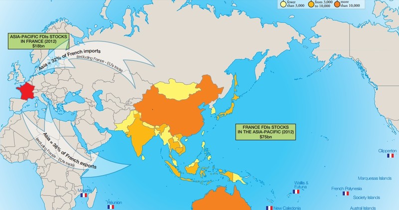Là một cường quốc biển, có sự hiện diện trên hầu hết các đại dương, Pháp có nhiều lợi ích trong việc duy trì hòa bình ổn định trong khu vực châu Á Thái Bình Dương. Một phần do vùng lãnh thổ của Pháp hiện diện trên Thái Bình Dương và Ấn Độ Dương, nhưng quan trọng hơn, 32% kinh tế thương mại nhập khẩu của Pháp xuất phát từ châu Á, và tỷ lệ xuất khẩu của sang châu Á chiếm 36% thương mại xuất khẩu. Tổng vốn đầu tư FDI từ châu Á vào Pháp tính đến năm 2012 khoảng 18 tỷ USD, vốn đầu từ FDI của Pháp vào châu Á chiếm khoảng 76 tỷ USD.