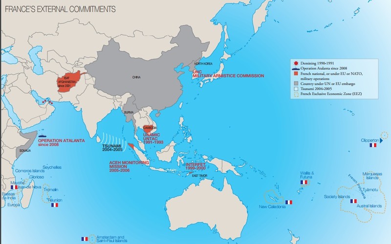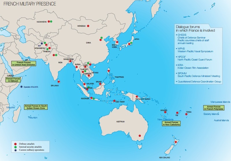 Để đảm bảo cho an ninh kinh tế và lợi ích quốc gia. Trên Thái Bình Dường Pháp đã thiết lập các cuộc đối thoại cấp cao và xây dựng quan hệ đối tác chiến lược với Nhật Bản (1995, đến cấp bộ trưởng vào năm 2012), Trung Quốc (1997), Ấn Độ (1998), Indonesia (2011), Úc (2012), Singapore (2012) và Việt Nam (2013). Pháp đã thiết lập một mối quan hệ chiến lược quốc phòng chặt chẽ với Malaysia.