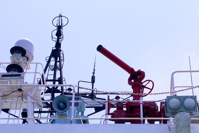 Trên tàu có nhiều vòi rồng - súng phun nước, hệ thống loa, đèn pha...