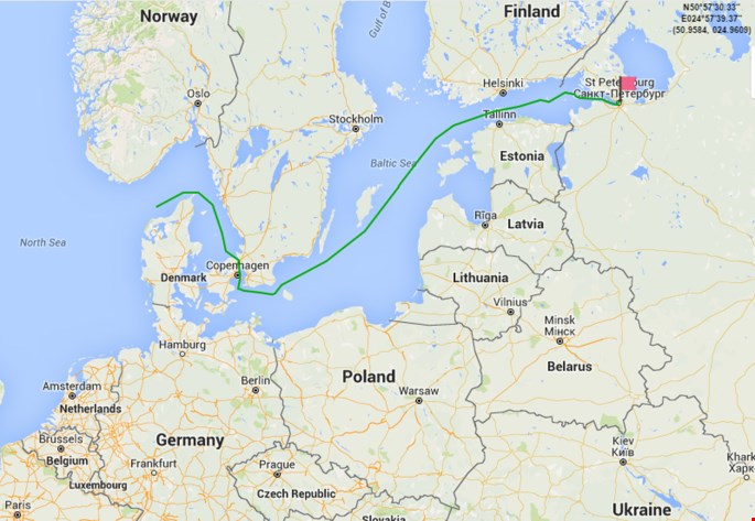 | Dự kiến hành trình của tàu hàng Rolldock Star từ Biển Bắc đến St. Petersburg đón tàu ngầm Đà Nẵng - Nguồn: Marinetraffic |