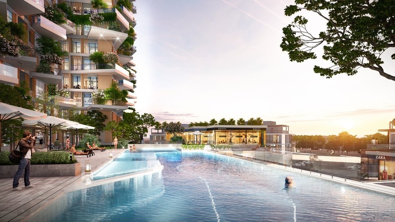 Điểm nhấn tiện ích của dự án là hệ thống thác tràn quy mô đổ từ tầng 3 xuống hồ nước giữa quảng trường resort.