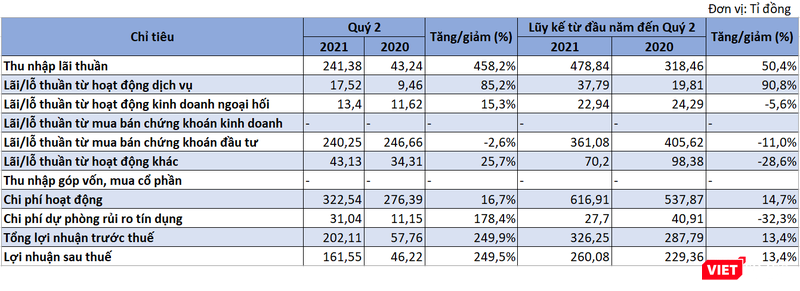 Kết Quý 2/2021, hầu hết các hoạt động kinh doanh của VietBank đều lãi lớn. Cụ thể, thu nhập lãi thuần đạt 241,3 tỉ đồng, tăng 5,5 lần (tăng 458%) so với cùng kỳ năm ngoái; lãi thuần từ hoạt động dịch vụ đạt 17,5 tỉ đồng, tăng 85,2%; lãi thuần từ hoạt động kinh doanh ngoại hối đạt 13,4 tỉ đồng, tăng 15,3%; lãi từ hoạt động khác là 43,1 tỉ đồng, tăng 25,7%.