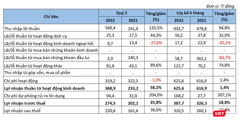 Kết quý 2/2022, VBB báo lãi trước thuế 274,5 tỉ đồng, tăng 35,8% so với cùng kỳ năm trước. Lợi nhuận sau thuế là 220,6 tỉ đồng, tăng trưởng 36,6% so với quý 2/2021.