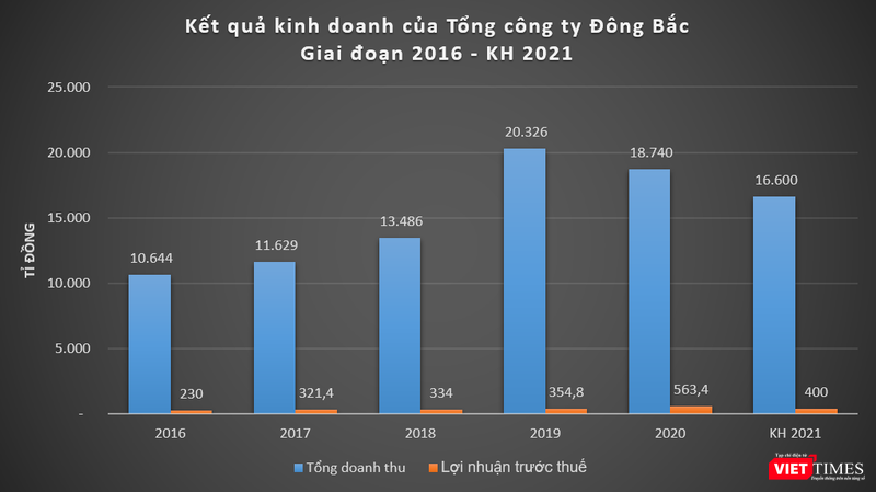 Năm 2021, Tổng công ty Đông Bắc đặt kế hoạch tổng doanh thu 16.600 tỉ đồng, giảm 11,4% so với năm ngoái. Lợi nhuận trước và sau thuế lần lượt ở mức 400 tỉ đồng và 320 tỉ đồng, giảm lần lượt 29% và 28% so với mức thực hiện năm 2020./.