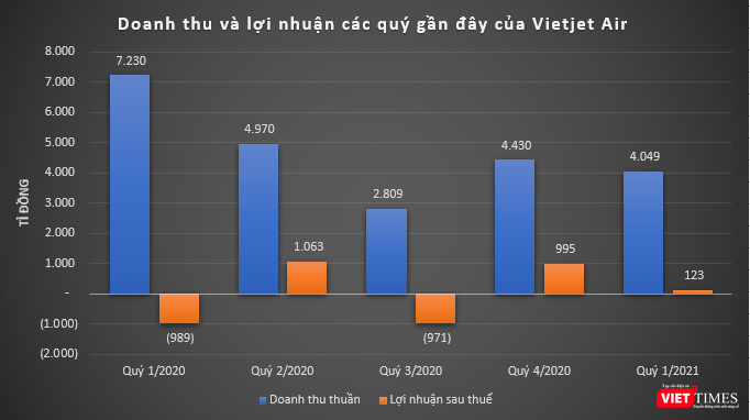 Kết Quý 1/2021, Vietjet báo lãi sau thuế hơn 123 tỉ đồng, trong khi cùng kỳ năm ngoái lỗ 989,4 tỉ đồng. Vietjet cho biết, số lợi nhuận này đến từ việc đầu tư dự án, đầu tư tài chính, phát triển dịch vụ hàng không, bù đắp cho các hoạt động khai thác vận tải hàng không.
