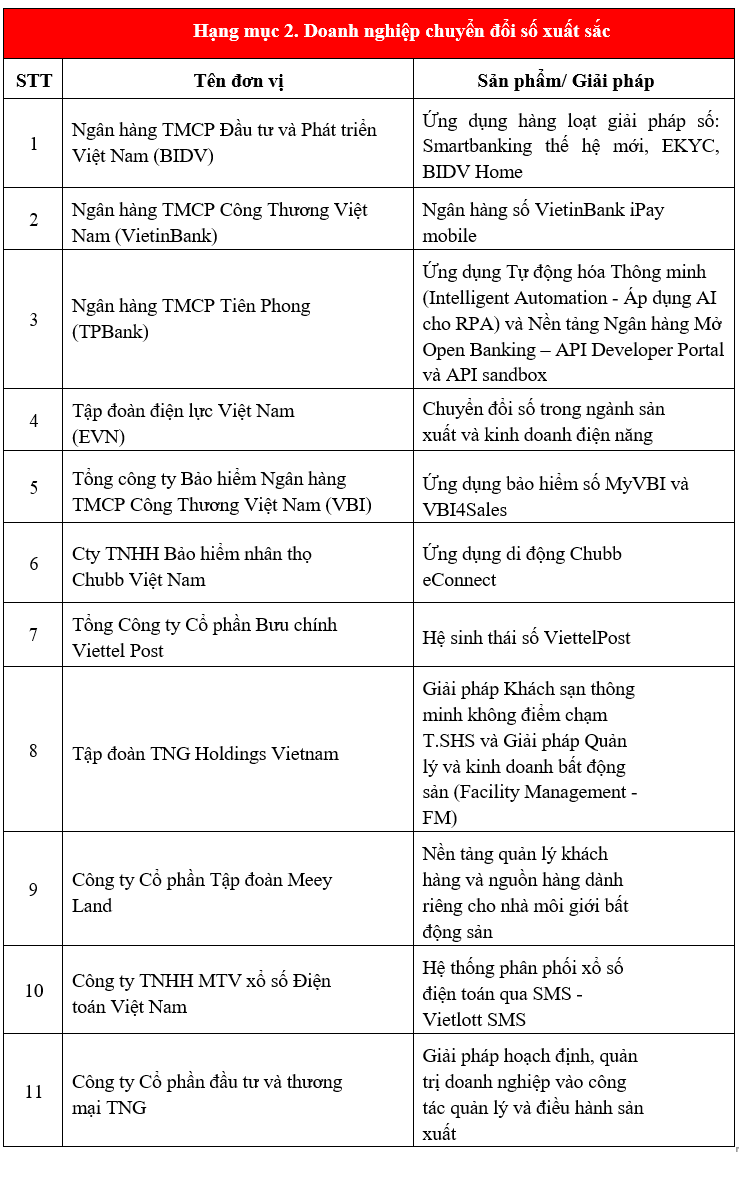 Hạng mục 2: Doanh nghiệp, đơn vị sự nghiệp chuyển đổi số xuất sắc