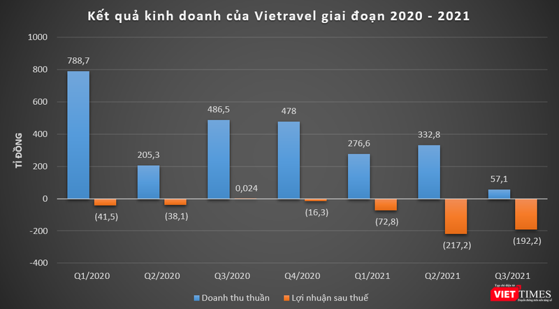 Trong quý 3/2021, Vietravel ghi nhận doanh thu thuần đạt 57,1 tỉ đồng, giảm 88% so với cùng kỳ năm trước. Kinh doanh dưới giá vốn, công ty này báo lỗ gộp 119 tỉ đồng, trong khi cùng kỳ năm trước báo lãi 65,3 tỉ đồng.