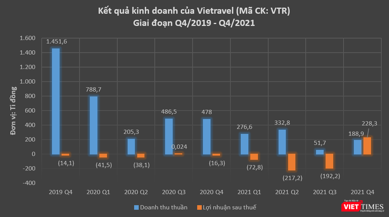CTCP Du lịch và Tiếp thị Giao thông Vận tải Việt Nam (Vietravel - Mã CK: VTR) vừa báo lãi trở lại sau 4 quý liên tiếp thua lỗ. Cụ thể, trong quý 4/2021, công ty này ghi nhận khoản lãi sau thuế lên tới 228,3 tỉ đồng, trong khi cùng kỳ năm trước báo lỗ 16,3 tỉ đồng.