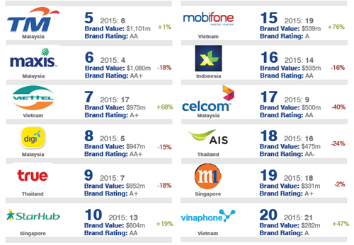 Thương hiệu viễn thông giá trị nhất Đông Nam Á 2016 của Brand Finance.