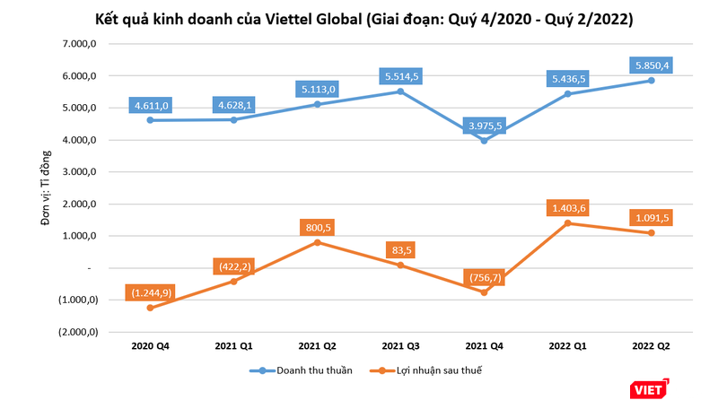 Tổng Công ty cổ phần Đầu tư Quốc tế Viettel (Viettel Global - Mã CK: VGI) vừa công bố kết quả kinh doanh hợp nhất quý 2 năm 2022 với doanh thu đạt 5.850,4 tỉ đồng, tăng 14% so với cùng kỳ năm trước.