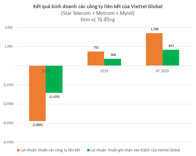 Lợi nhuận thuần qua đó tăng vọt từ 200 tỷ lên 1.708 tỷ đồng, trong đó phần ghi nhận vào kết quả kinh doanh của Viettel Global đạt 837 tỷ đồng.