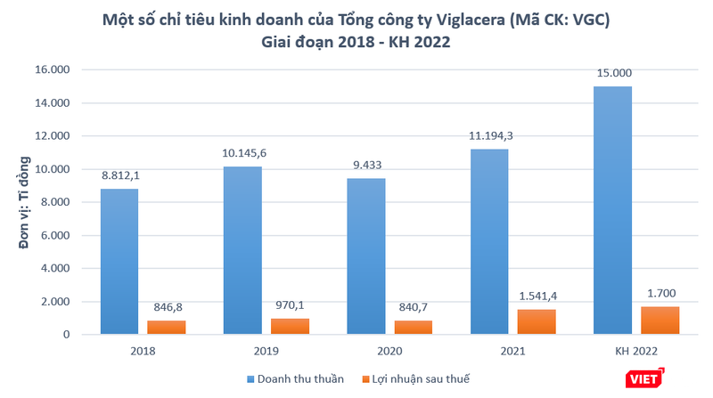 Cụ thể, Viglacera đặt mục tiêu doanh thu hợp nhất năm 2022 đạt 15.000 tỉ đồng và lợi nhuận trước thuế đạt 1.700 tỉ đồng, tăng lần lượt 34% và 10% so với thực hiện năm 2021.