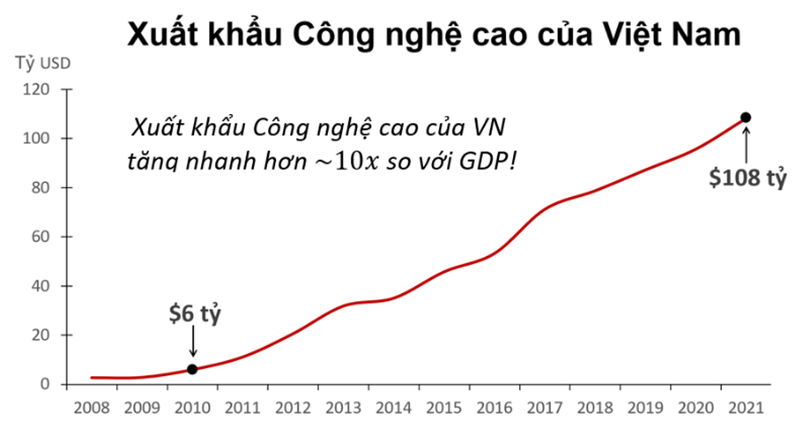 Theo ghi nhận của VinaCapital, Intel và Samsung đều tăng cường sản xuất tại các nhà máy đầu tiên của họ ở Việt Nam vào năm 2010 và xuất khẩu công nghệ cao của Việt Nam sau đó đã tăng gần 20 lần, cùng thời điểm mà nền kinh tế Việt Nam về cơ bản đã tăng trưởng gấp hai lần.