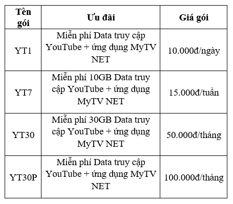Thêm vào đó, tất cả các gói Data Youtube của VinaPhone cũng miễn phí hoàn toàn Data truy cập ứng dụng MyTV NET, xem các kênh truyền hình trong nước, quốc tế và kho phim truyện HD theo yêu cầu. Để đăng ký các gói trên, khách hàng chỉ cần soạn DK [Tên gói] gửi 888.