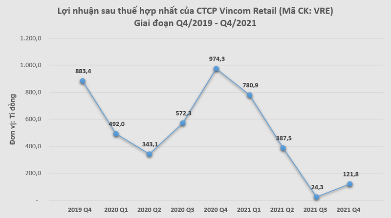 Kết quý 4/2021, lợi nhuận sau thuế của VRE đạt 122 tỉ đồng, chỉ bằng 1/8 cùng kỳ năm trước nhưng tăng gấp 5 lần so với quý 3/2021. Lũy kế cả năm 2021, VRE báo lãi sau thuế đạt 1.315 tỉ đồng, giảm 44,8% so với thực hiện năm 2020.