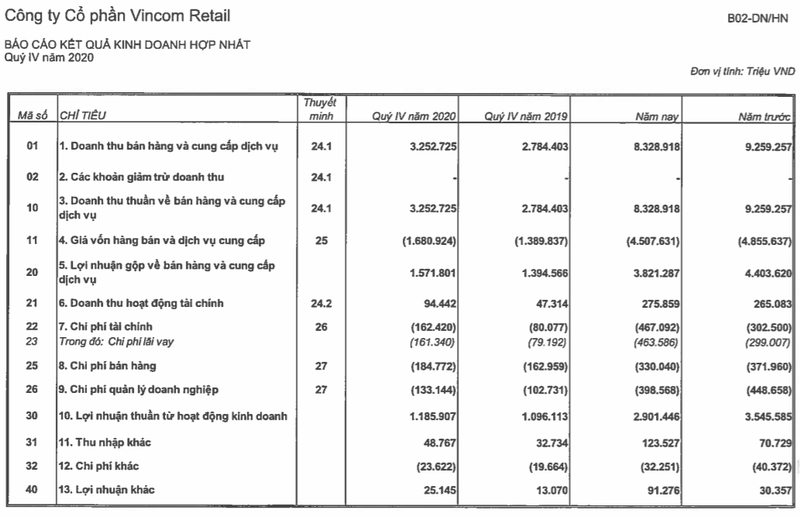 Lợi nhuận sau thuế hợp nhất Quý 4/2020 của Vincom Retail đạt 975 tỉ đồng, tăng 10,3% so với cùng kỳ năm trước và tăng 70,3% so với quý trước.