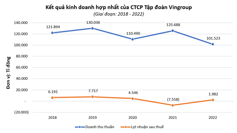 Lũy kế cả năm 2022, tổng doanh thu thuần hợp nhất quy đổi của Vingroup đạt 130.759 tỉ đồng, tương đương mức thực hiện năm 2021. Lợi nhuận trước thuế năm 2022 đạt 12.694 tỉ đồng, và lợi nhuận sau thuế đạt 1.982 tỉ đồng.
