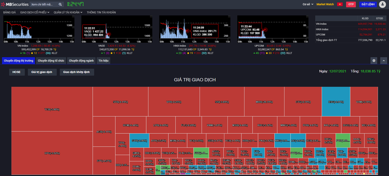 Thị trường chứng khoán sáng 12/7 chứng kiến 3 nhịp rơi mạnh, chỉ số VN-Index có lúc giảm tới hơn 70 điểm, lùi về ngưỡng 1.273,56 điểm. Tương tự, chỉ số VN30-Index có lúc để mất tới 80 điểm, lùi về ngưỡng 1.407,98 điểm.