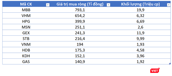 MBB là cổ phiếu đứng đầu về giá trị mua ròng của khối ngoại trong tuần qua, đạt mức 793,1 tỉ đồng. Tiếp đến là các cổ phiếu VHM (654,2 tỉ đồng), HPG (399,9 tỉ đồng), MSN (251,1 tỉ đồng) và GEX (241,3 tỉ đồng).
