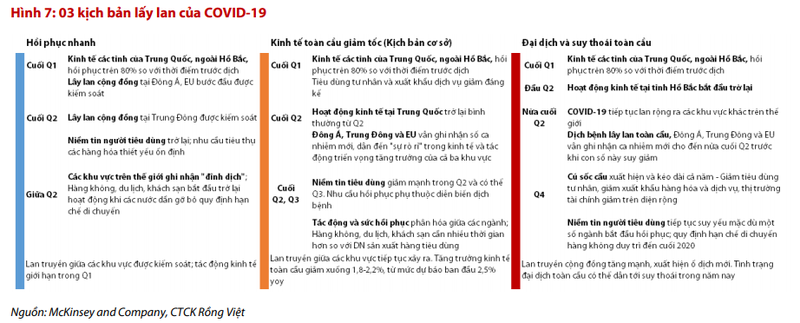 Trong một báo cáo công bố mới đây, CTCP Chứng khoán Rồng Việt (VDSC) đã đề ra 3 kịch bản lây lan của Covid-19, với kịch bản cơ sở là nền kinh tế toàn cầu giảm tốc.