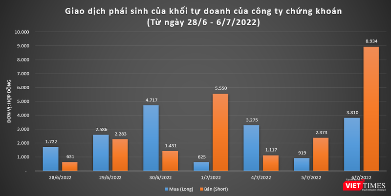 Theo tính toán của VietTimes, khối lượng giao dịch của khối tự doanh chỉ chiếm khoảng 2,2% thanh khoản của thị trường phái sinh trong phiên giao dịch ngày 6/7.