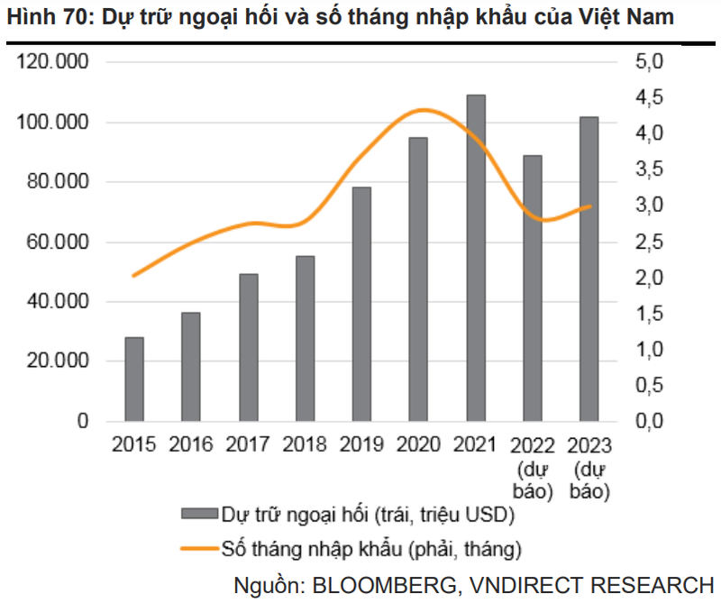 Theo VNDirect, trong 10 tháng đầu năm 2022, NHNN đã bán một lượng lớn dự trữ ngoại hối để ổn định tỷ giá (khoảng 20%). Điều này đã khiến dự trữ ngoại hối của Việt Nam giảm xuống dưới mức khuyến nghị của Quỹ tiền tệ quốc tế (IMF), tức là thấp hơn 3 tháng nhập khẩu.