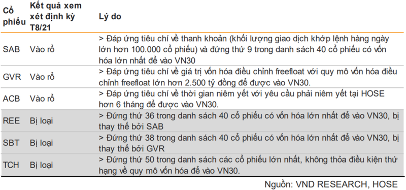 Đối với cổ phiếu GVR của Tập đoàn Công nghiệp Cao su Việt Nam, VNDriect cho biết giá trị vốn hóa thị trường của GVR vẫn duy trì trên 80.000 tỉ đồng kể từ tháng 12/2020, giúp cho giá trị vốn hóa điều chỉnh freefloat lớn hơn 2.500 tỉ đồng và có thể được đưa vào rổ VN30 trong đợt xem xét chỉ số định kỳ lần này.