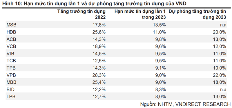 Báo cáo của VNDirect điểm danh 11 ngân hàng thương mại đã được NHNN cấp hạn mức tín dụng lần đầu năm 2023, dẫn đầu là MSB với hạn mức tín dụng lần 1 ở mức 13,5%.