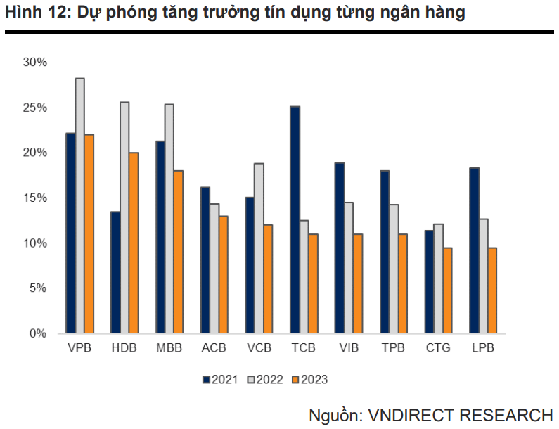 Dự báo tăng trưởng tín dụng cả năm 2023, VNDirect cho rằng tăng trưởng tín dụng của VPBank và HDBank sẽ dẫn đầu danh sách trên với mức tăng trưởng tín dụng lần lượt đạt 22% và 20%.