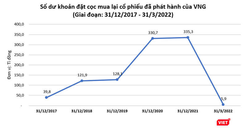 Dữ liệu của VietTimes thể hiện, trong 5 năm qua, khoản đặt cọc liên quan đến việc mua cổ phiếu quỹ của VNG liên tục gia tăng, từ mức 39,8 tỉ đồng tại ngày 31/12/2017 lên mức 335,3 tỉ đồng tại ngày 31/12/2021. Dù đặt cọc cả đống tiền, VNG vẫn chưa mua thêm cổ phiếu quỹ trong khoảng thời gian này mà chỉ bán ra cho các nhà đầu tư khác.
