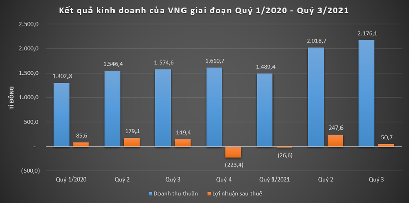 Kết thúc quý 3/2021, VNG báo lãi sau thuế ở mức 50,7 tỉ đồng, giảm 66% so với cùng kỳ. Lãi sau thuế của cổ đông công ty mẹ đạt 169,8 tỉ đồng, giảm 20% so với cùng kỳ năm 2020.