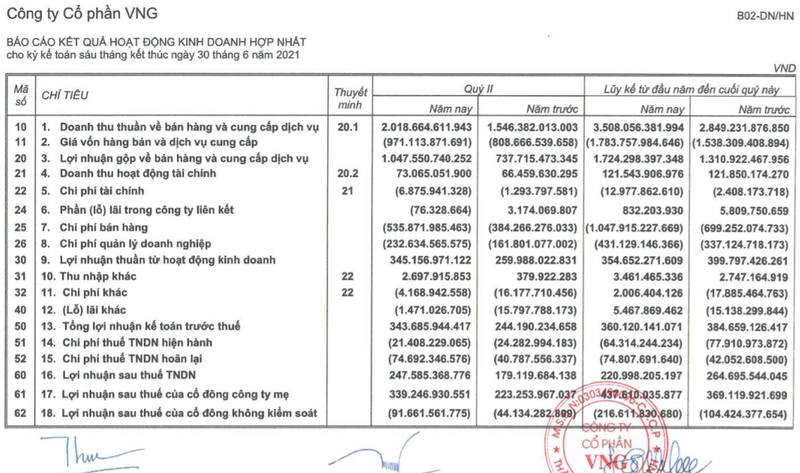 VNG báo lãi sau thuế nửa đầu năm 2021 ở mức 221 tỉ đồng, giảm 16,5% so với cùng kỳ năm 2020. Lợi nhuận sau thuế của cổ đông công ty mẹ đạt 437,6 tỉ đồng, tăng 18,5% so với cùng kỳ năm 2020.