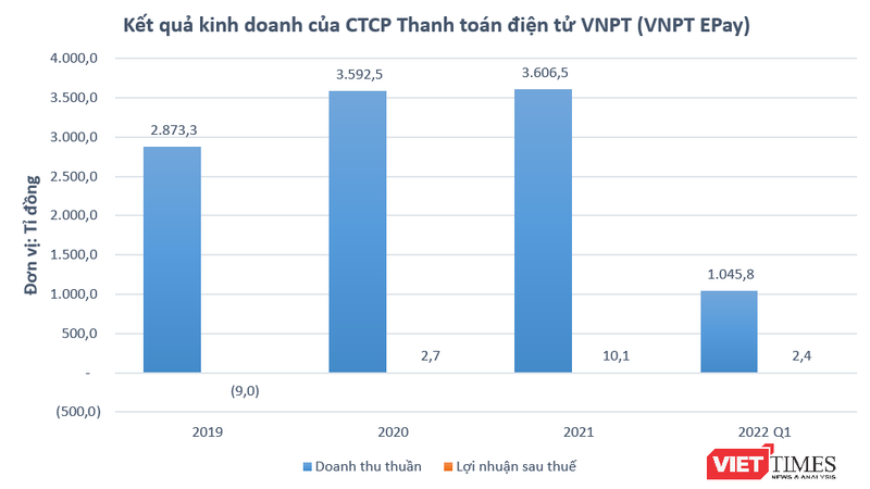 Kết thúc quý 1/2022, VNPT Epay ghi nhận doanh thu thuần đạt 1.045,9 tỉ đồng, tăng 22% so với cùng kỳ năm trước. Lợi nhuận sau thuế ở mức 2,44 tỉ đồng, tăng 64,5% so với quý 1/2021.
