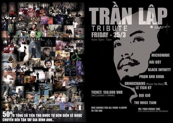 Trong khi đó, một đêm nhạc quy tụ đông đảo các ban nhạc rock, các ca sĩ nhằm mục đích tưởng nhớ Trần Lập diễn ra vào tối 25-3 tại Acoustic Bar (TP.HCM) có sự góp mặt của nhiều gạo cội của rock Việt: ban nhạc Microwave, Black Infinity, Bụi Gió, Oringchains, Bụi Gió, Acoustic Band, ca sĩ Phạm Anh Khoa, Hải Bột, Lê Tích Kỳ…