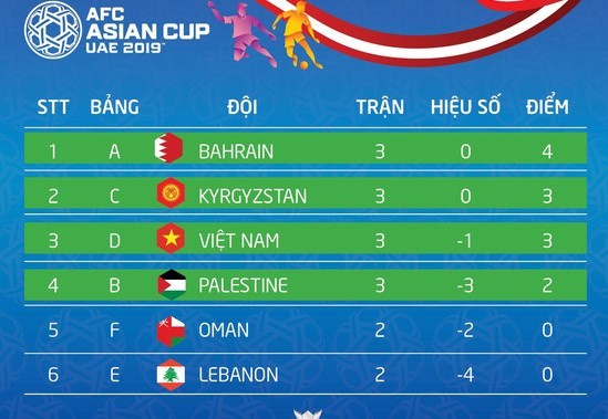 Sau lượt trận cuối cùng bảng C và D đêm 16-1, Asian Cup 2019 đã xác định thêm đội hạng ba nối bước Bahrain (bảng A) giành quyền đi tiếp là Kyrgyzstan (thắng Philippines 3-1).