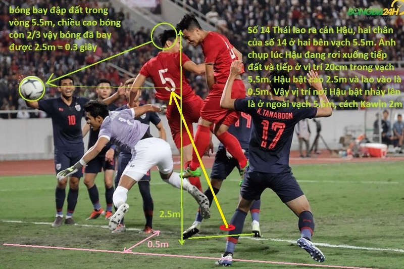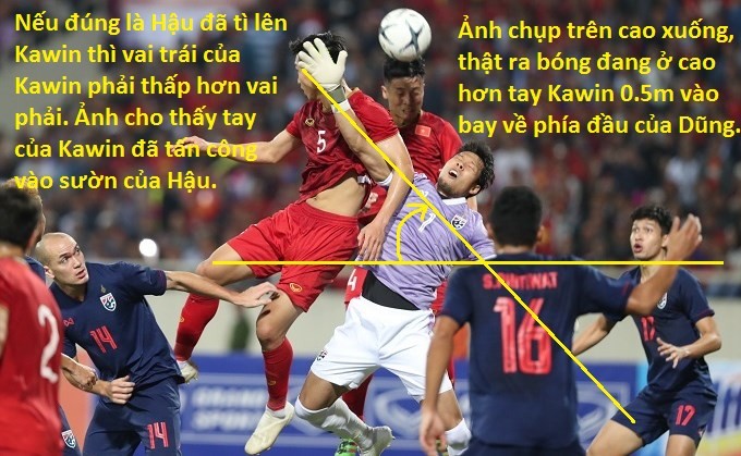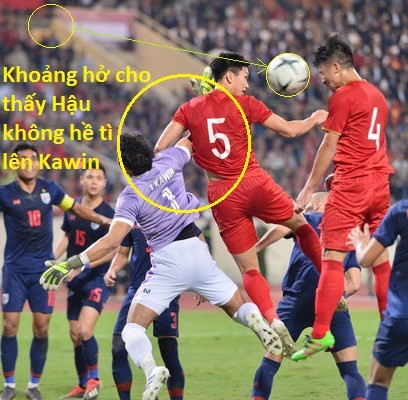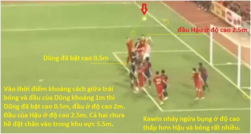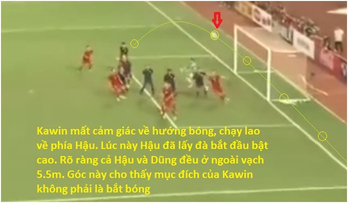 Trong toàn bộ thời gian bóng bay, Hậu và Dũng không hề đặt chân vào khu vực 5.5m cũng như không hề cản phá hay va chạm với thủ môn Kawin của đội Thái. Thủ môn Kawin do sợ quả bóng đi thấp nên lùi về phía trái cầu môn đề phòng. Khi bóng lên cao Kawin bị mất hoàn toàn cảm giác hướng bóng bay, Kawin quay người quan sát và thấy Hậu bật lên, nên đã chủ động lao về phía Hậu để cản phá. Khoảng cách giữa Hậu và Dũng chỉ khoảng nửa mét. Hậu đã nhảy lên cao để thực hiện động tác đánh đầu đưa bóng vào gôn. Do đang ở trên cao chẳng những Hậu không còn khả năng tránh Kawin, mà chính Hậu phải được ưu tiên vì đang làm động tác đánh đầu uy hiếp trực tiếp khung thành của Kawin. Dũng là phương án dự phòng khi trái bóng chọn điểm đến không chính xác.