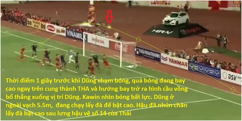 Phân tích quỹ đạo bay của trái bóng chúng ta sẽ nhận thấy hành vi của từng cầu thủ. Quỹ đạo bay của trái bóng rất quái đản, nó đi từ thấp lên cao, từ phía cầu môn đi lên, và bổ nhào rất nhanh nơi Tiến Dũng đã chờ. Không có bất kể ai có thể chạm được vào bóng ngoài vị trí mà Tiến Dũng bật lên.