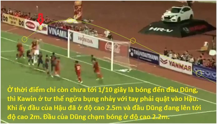 "Các cầu thủ Hậu và Dũng đang trên đường tấn công, đón đường bóng bay theo quỹ đạo cầu vồng từ phía cuối sân lên và từ trên cao xuống, không thể bị coi là cản không bóng. Không có ai để cản cả.