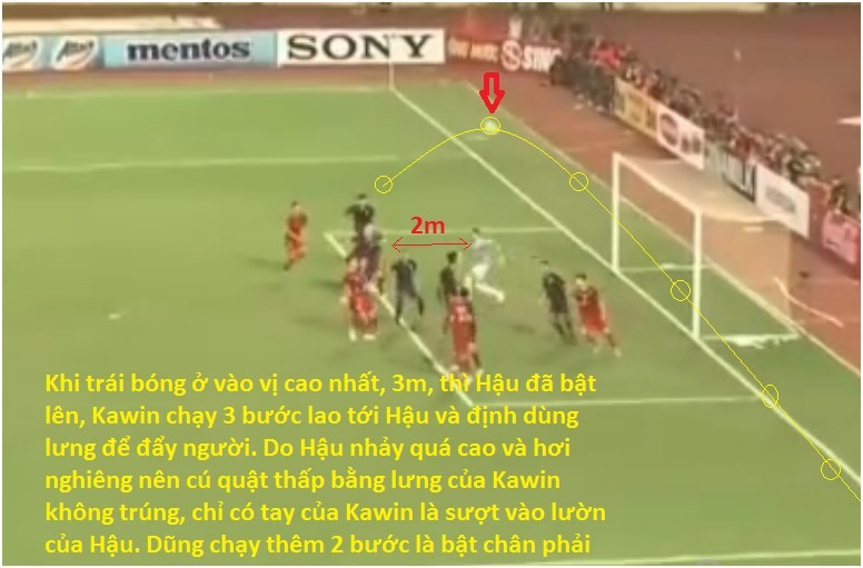 Hậu nhảy và rơi thẳng tại vị trí của mình, Kawin mất cảm giác bóng khi hướng bóng lao thẳng vào mặt, nên đã chủ động lao vào phá Hậu từ khoảng cách 2m. Hậu tiếp đất bằng chân, không ngã.