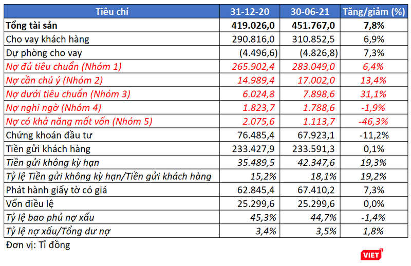 Trên bảng cân đối, tính đến ngày 30/6/2021, quy mô tổng tài sản của VPBank đạt 451.767 tỉ đồng, tăng 7,8% so với đầu năm.
