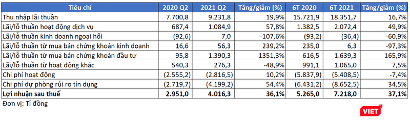 Trong đó, thu nhập lãi thuần của VPBank trong kỳ đạt 9.231,8 tỉ đồng, tăng 19,9% so với cùng kỳ năm 2020. Lãi từ mua bán chứng khoán đầu tư đạt 1.390,3 tỉ đồng, tăng 13 lần so với cùng kỳ năm trước. Hoạt động dịch vụ cũng đem về cho VPBank khoản lãi 1.084,9 tỉ đồng trong quý 2/2021, tăng gấp rưỡi so với cùng kỳ năm trước.Động lực cho đà tăng trưởng lợi nhuận quý 2/2021 của VPBank chủ yếu đến từ thu nhập lãi thuần, hoạt động dịch vụ và lãi từ mua bán chứng khoán đầu tư.