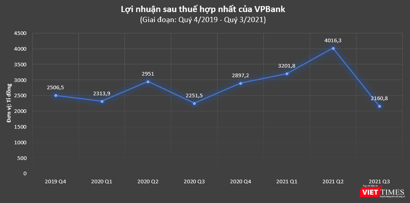 Luỹ kế 9 tháng đầu năm 2021, nhà băng này báo lãi hợp nhất trước thuế 11.735,7 tỉ đồng, tăng 24,8% so với cùng kỳ năm trước. Lợi nhuận sau thuế hợp nhất của VPBank đạt 9.378,9 tỉ đồng, tăng 24,7% so với 9 tháng đầu năm 2020.