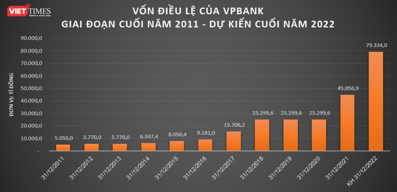 Sau các đợt phát hành vừa nêu, theo tính toán của VietTimes, quy mô vốn điều lệ của VPBank dự kiến sẽ tăng lên mức 67.434 tỉ đồng.