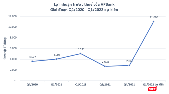 Truyền thông trong nước dẫn nguồn tin từ lãnh đạo VPBank cho biết, lợi nhuận trước thuế hợp nhất quý 1/2022 của ngân hàng này có thể đạt hơn 11.000 tỉ đồng, mức tăng trưởng rất cao so với quý liền trước và cùng kỳ năm 2021.