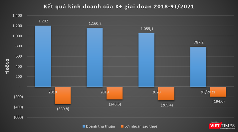 Tính đến cuối quý 3/2021, lỗ lũy kế của K+ là hơn 3.747 tỉ đồng; trong khi vốn chủ sở hữu ở mức âm 3.403 tỉ đồng.