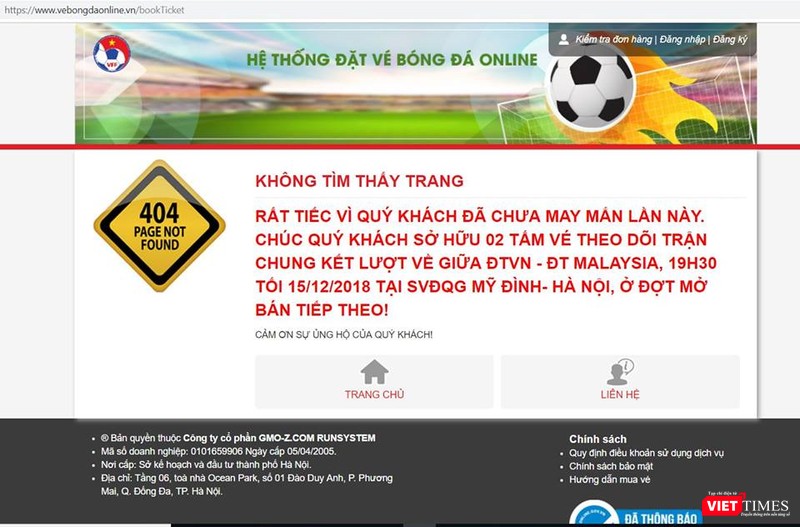 LĐBĐVN khẳng định chỉ hợp tác với duy nhất đơn vị: Công ty Cổ phần GMO-Z.com RUNSYSTEM để bán vé bóng đá online cho các trận đấu tại giải đấu AFF Suzuki Cup 2018 theo 02 địa chỉ: https://vebongdaonline.vn và https://vebongdaonline.com.vn. Hiện cả 2 website trên đều đã được đăng ký với Cục Thương mại Điện tử và Kinh tế số của Bộ Công thương.