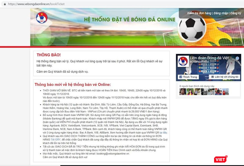 Cùng với đó, đúng 10h sáng nay (10/12), Liên đoàn bóng đá Việt Nam (VFF) mở bán vé trận chung kết lượt về AFF Cup 2018 giữa tuyển Việt Nam và Malaysia trên sân Mỹ Đình. Tuy nhiên, cũng như lần bán vé trận bán kết lượt về giữa Việt Nam và Philippines cách đây ít ngày, các địa chỉ mua vé được VFF cung cấp trước đó như vebongdaonline.vn; vebongda.vff.org.vn; ticketonline.vff.org.vn... đều không thể truy cập.