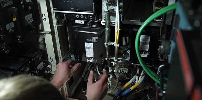 Một nhân viên kỹ thuật đang lắp đặt khối kết nối vệ tinh lên máy bay Boeing 747